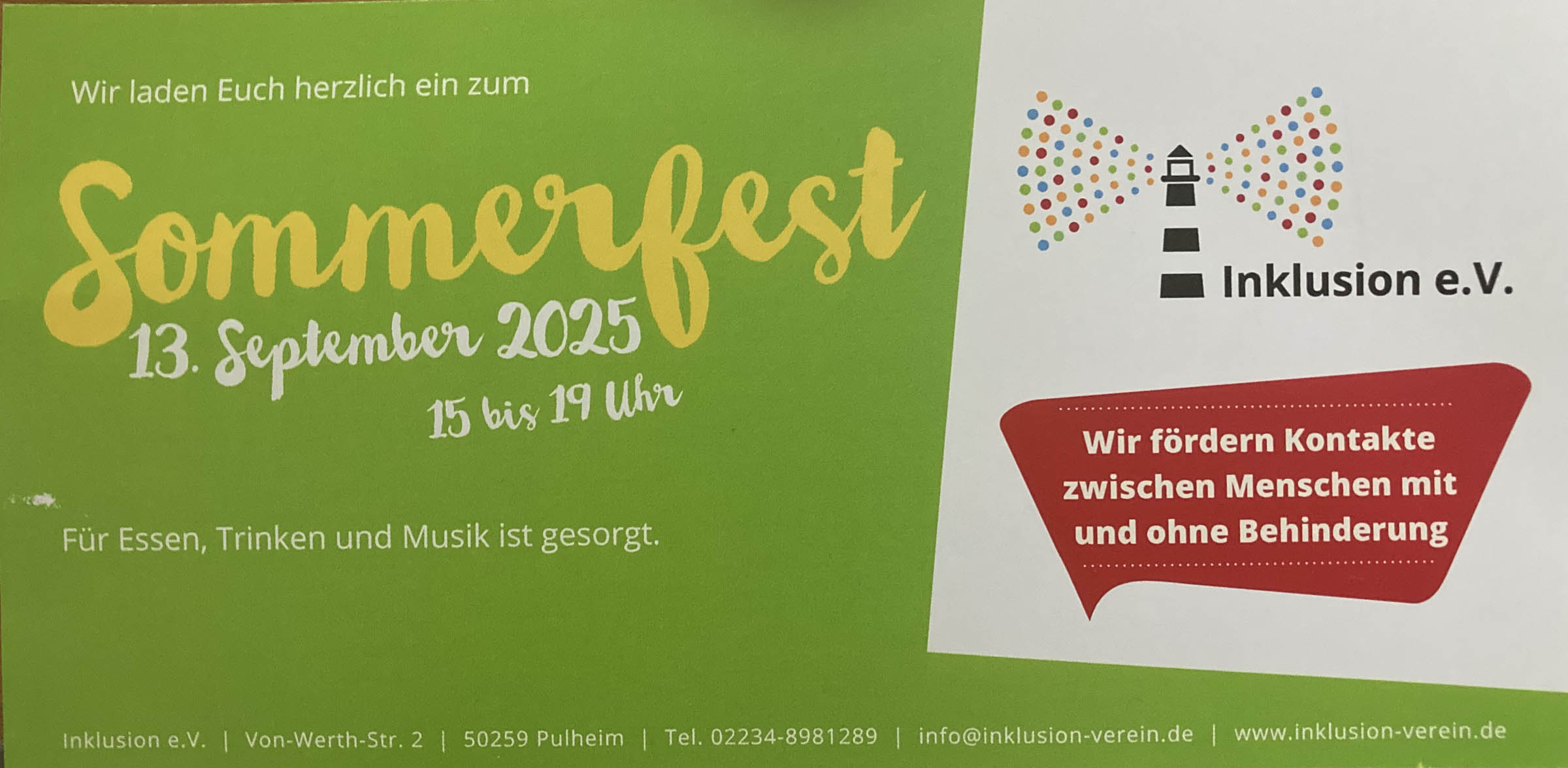 Die 11. Mitgliederversammlung von Inklusion e.V. findet nach einem Beschluss des Vorstandes am 15. Oktober 2025 ab 19.00 Uhr in der Betriebsstätte des Arbeitsprojekts in Brauweiler Von-Werth-Straße 2 statt.